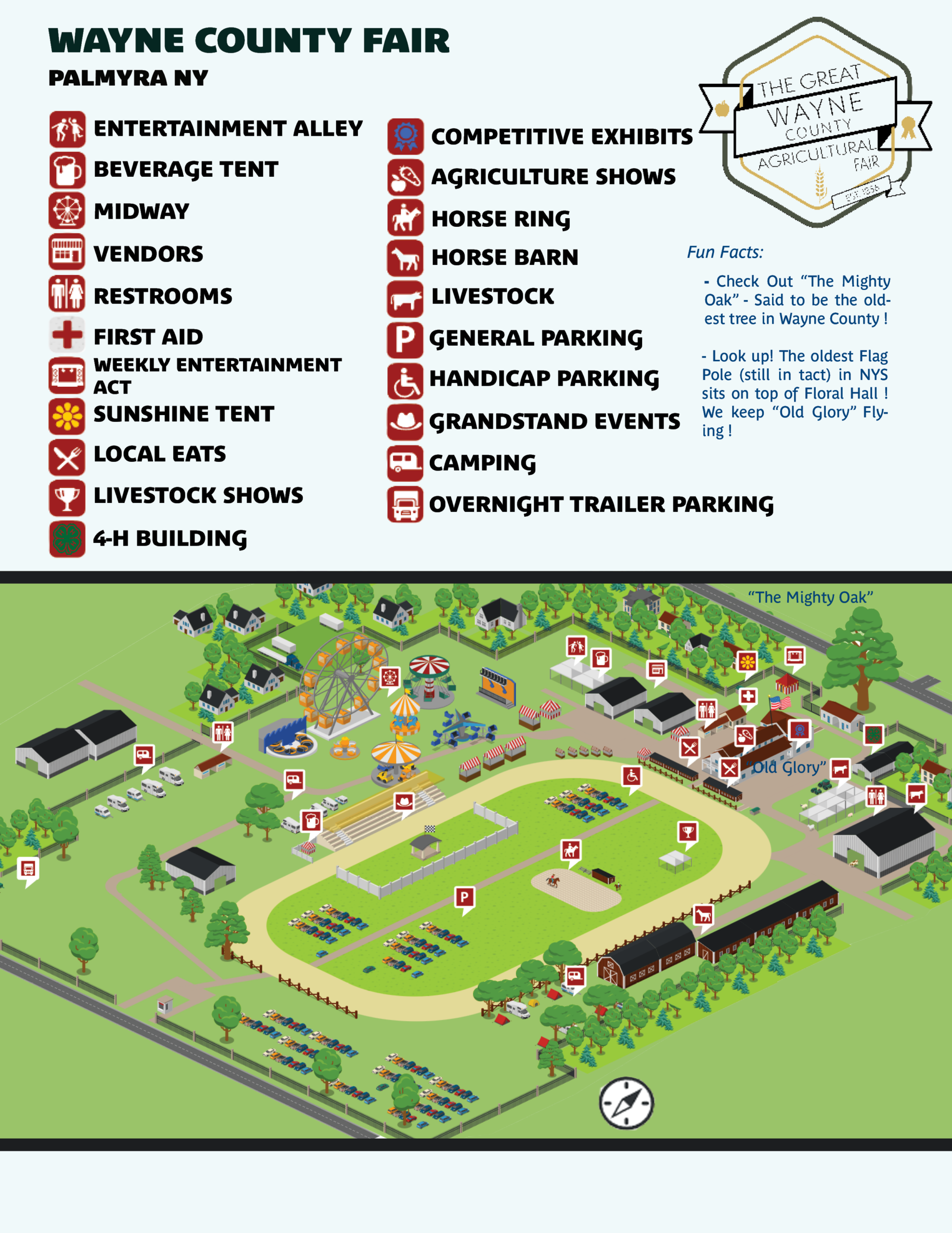 If, during the fair hours (10 am – 10 pm) you require transportation assistance bringing in / taking out materials (or yourself) please notify the fair office [next to the First Aid building, just west of Floral Hall or call 315-597-5372 when entering the grounds].